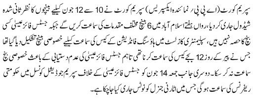 نمائندہ ایکسپریس کے مطابق سپریم کورٹ نے 10 سے 12 جون کے لیے بیینچوں کو نظر ثانی شدہ شیڈول جاری کیا، رواں ہفتے عدالت میں 6 بینچز مختلف مقدمات کی سماعت کریں گے۔