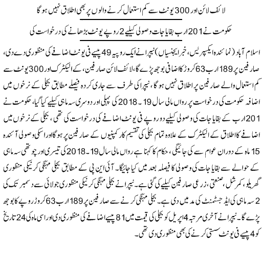 اسلام آباد: نیپرا نے بجلی کے فی یونٹ قیمتوں میں اضافہ کردیا جس کا اطلاق کے الیکٹرک صارفین پر نہیں ہوگا، لائف لائن اور 300 یونٹ سے کم استعمال کرنے والوں پر اطلاق نہیں ہوگا، حکومت نے 201 ارب روپے کے بقایاجات کی وصولی کے لیے 2 روپے فی یونٹ مہنگا کرنے کی سفارش کی تھی۔