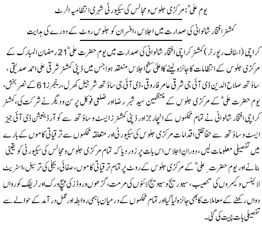 یوم علی کی مجلس نشتر پارک میں ہوگی اُس کے بعد جلوس بجائے نمائش سے کپیری اور سیون ڈے کے بجائے نوائے وقت چورنگی سے نکلنا شروع ہوگا، قائد اعظم کے مزار سے پیپلزپارٹی سیکریٹریٹ اور پھر وہاں سے نیو ایم اے جناح روڈ سے ہوتا ہوا ایمپریس مارکیٹ پھر صدر پہنچے گا۔