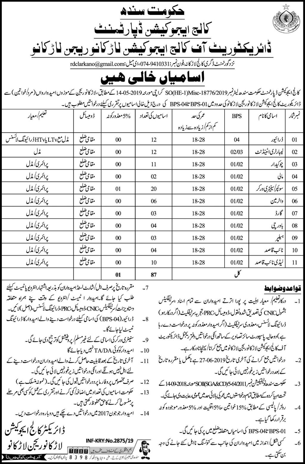سندھ حکومت نے ایجوکیشن ڈیپارٹمنٹ (محکمہ تعلیم) میں ضلع لاڑکانہ کے لیے 70 خالی اسامیوں پر نوکریاں دینے کا اعلان کردیا۔ جس کا اشہتار 29 مئی 2019 کے ایکسپریس اخبار میں شائع ہوا۔